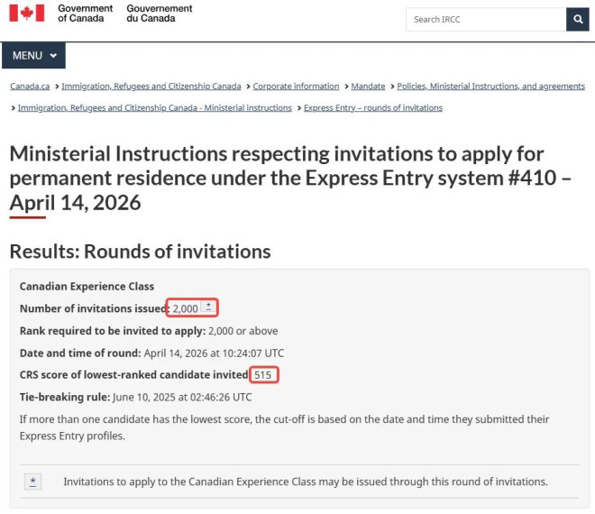 CEC 抽签的 CRS 分数线升至 515 分,高于 3 月 31 日上次抽签的 509 分,打分优先时间追溯至 2025 年 6 月 10 日,间隔超过 10 个月。