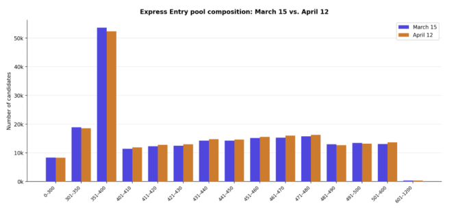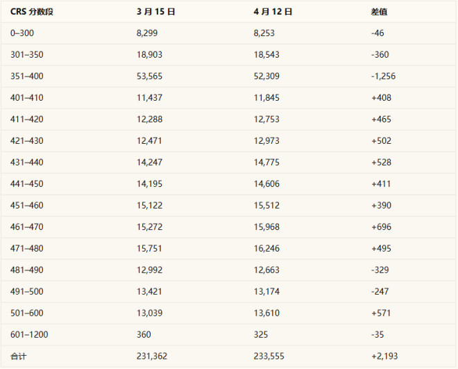 自 3 月 15 日(上一次分数池数据更新)至 4 月 12 日,Express Entry 分数池从 231,362 个档案增至 233,555 个,净增 2,193 个。这是自今年 2 月初以来首次出现人数增加而非减少。