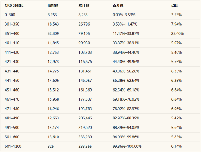 这与此前持续收缩的趋势形成鲜明对比。尤其是 401–480 分中段档案大量涌入,说明越来越多具备加拿大工作经验或其他资历的申请人进入 Express Entry 系统。当