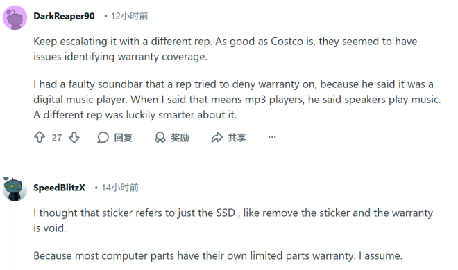 有网友指出:”客服根本没理解,贴纸作用是散热,不能随意撕掉,但只要没动贴纸就不算违规。”更有网友认为,Costco在处理过程中似乎在”找理由拒保”,并建议继续申诉、要求升级至更专业的团队。原帖作者回应称,每次致电都被告知会升级处理,但进展缓慢,目前还在等待进一步答复。