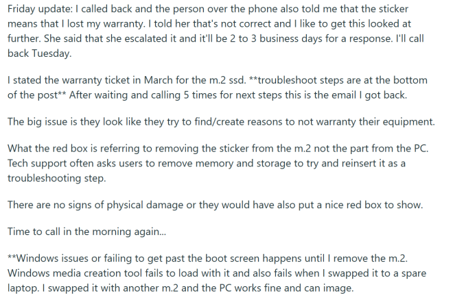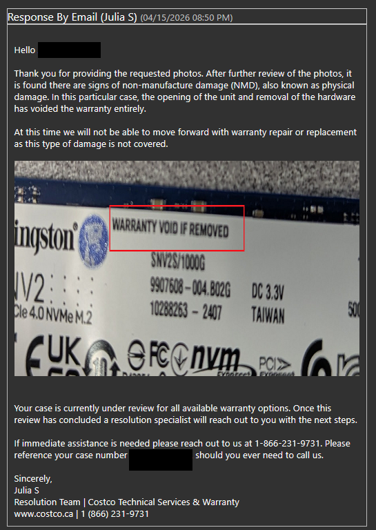 他的经历是这样的:台式机SSD故障后,按客服指引拆开机器,结果却因”SSD标签问题”被认定丧失保修。原帖指出,Costco技术支持将SSD上的保修贴纸误解为”拆卸即失保”,实际上标签并未被移除,仅是取下SSD本身做故障排查——这本是技术人员常规的排查步骤。