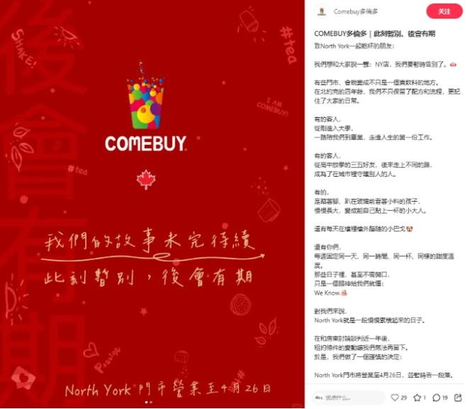 北约克COMEBUY奶茶店(4年):营业至4月26日。