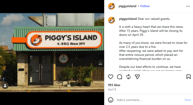 北约克Piggy’s Island韩国烧烤(15年):4月29日正式歇业。