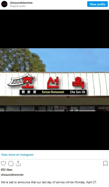 朝鲜屋Cho Sun Ok(21年):营业至4月27日。