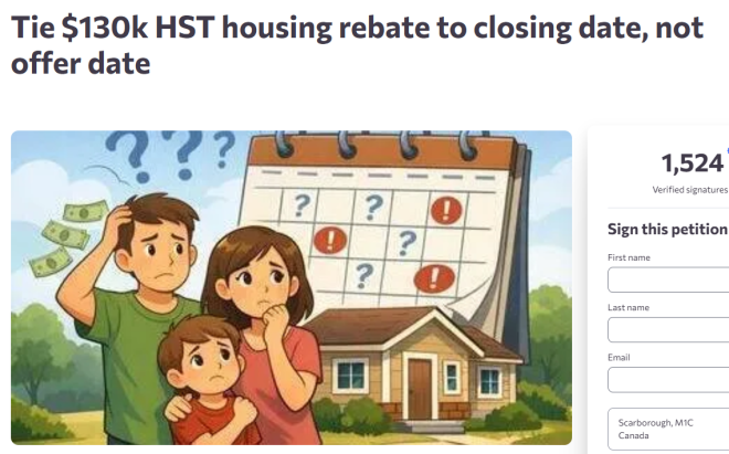 出台 $13 万 HST 住房退税政策后,超过 500 个安省家庭找到了共同的痛点。他们原本期待政府的住房补助能带来一线希望,却因一份新规被意外排除——$13 万 HST 退税政策以签约日为界,让数百名早签约的买家瞬间失利。如今他们联名请愿,要求省财政厅改弦更张。