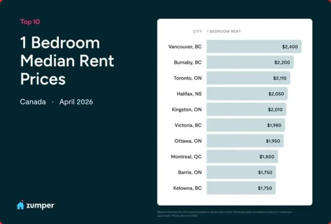 报告显示,温哥华依旧是加拿大一居室租金最贵的城市,4月一居室中位租金达到2400加元,较上月上涨0.4%。