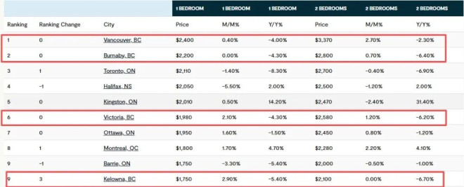 基洛纳涨幅更为突出,一居室租金上涨2.9%至1750加元,排名升至全国第九,并重新进入全国租金前十榜单。
