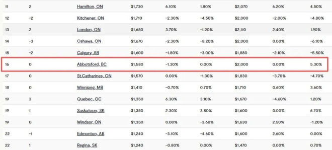此外,阿伯茨福德也进入全国租金最贵城市前20名,目前排名第16位。