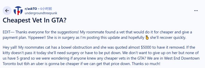 多伦多宠物医疗市场的价格离谱到让人窒息。近日一位网友在社交平台发帖求救,室友的猫咪因肠道堵塞被医院开价近 $5000 做手术。最后通牒很残酷:如果猫咪今天排不出来,就只能选择手术或安乐死。医疗费用的高压让他们三人无奈求助网友——有没有便宜点的兽医诊所?