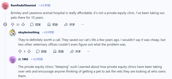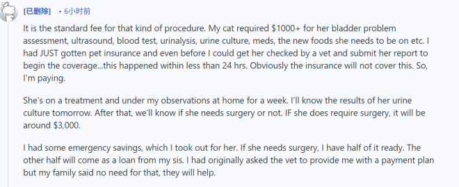 帖子一发,共鸣接踵而至。不少养宠家庭都有类似遭遇。有网友为猫咪的膀胱问题做了检查、化验、药物和特种猫粮的组合诊疗,光这些就花了 $1000 多元,如果后续需要手术还得再准备 $3000。还有人去年为猫咪肾脏感染住院,前后花了 $8000。