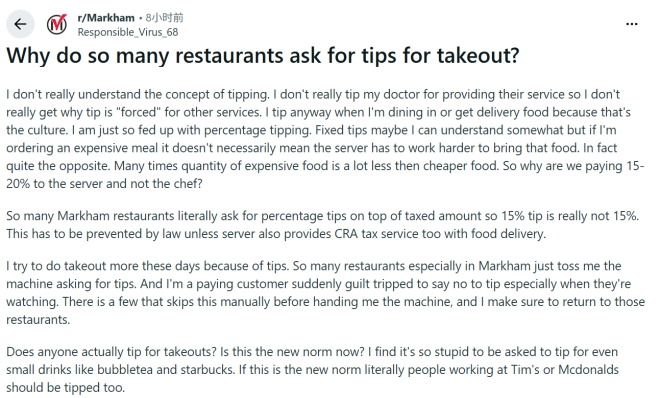 万锦本地外卖小费风波,反映出社区对当前“小费文化”蔓延的普遍焦虑。不少华人认为,合理的小费应基于优质服务,而非被动或强制。也有声音呼吁出台相关规范,限制收银终端小费设置,维护消费者的选择权。