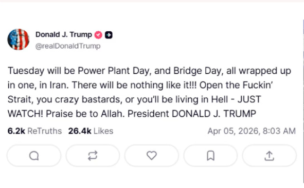 复活节后的星期二,他发出了其总统任期内最戏剧性的最后通牒,称除非伊朗在12小时内达成协议,否则“整个文明将会灭亡”。