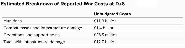 美国智库“战略与国际研究中心”(CSIS)指出,据《纽约时报》所称,这一数字“似乎只计算了行动中未列入预算的开支”,并不包括“第一波打击前军事硬件和人员集结”的庞大费用,也不包括修复受损设施,或更换战损装备的估值。