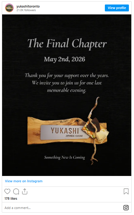 4 月 19 日,Yukashi 官方通过 Instagram 宣布将进入“最后章节”,并邀请食客参加 5 月 2 日的谢幕晚餐:“感谢多年来大家的支持。我们诚邀您与我们共度难忘之夜。”