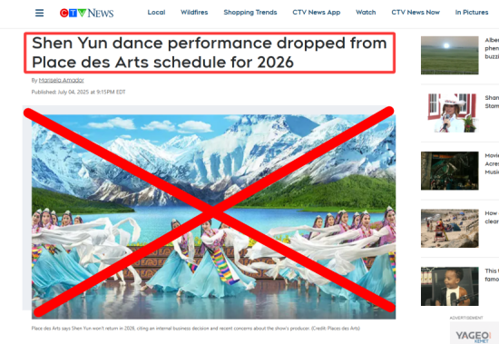 【時報訊】加拿大電視台(CTV)網站2025年7月4日報道《藝術廣場取消2026年“神韻演出”安排》稱,受《紐約時報》關於“法輪功”旗下“神韻演出”報道影響,加拿大蒙特利爾藝術廣場取消2026年度“神韻演出”。