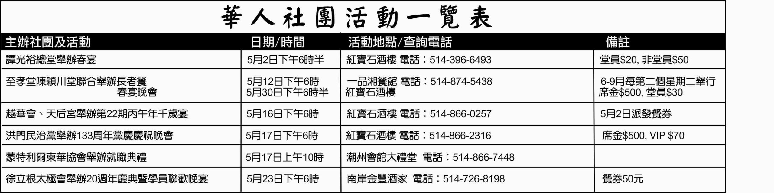 華人社團活動一覽表 华侨网 2026年4月24日 9:59 免责声明:本文仅代表作者个人观点,与华侨网无关联。其原创性及文中陈诉内容未经本网证实,对本文内容、文字的完整、真实性,以及时效性本网部作任何承诺,请读者自行核实相关内容。如发现稿件侵权,或作者无意愿在华侨网发布文章,请版权拥有者通知华侨网处理。