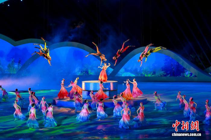 深海逐梦,奇幻天涯。当儒艮、鲸鲨、海龟等海洋生物装置从观众席“游”向舞台,两只巨大的水母在凌空悠游,整个舞台变成海底世界。在这里,潜水员与水母互动,与红珊瑚温情相拥,以诗意视觉诠释海南海洋文化,传递“人与自然和谐共生”的理念。