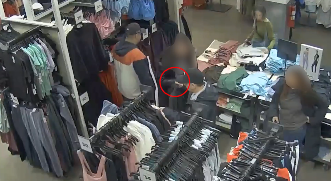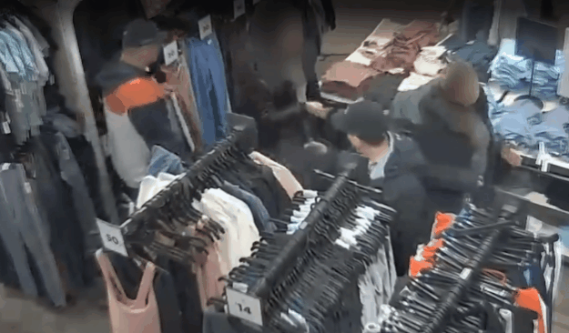 视频中,三名嫌疑人一同进入店内,尾随两名女性购物者。其中一名男子拿起一条运动裤,走到受害者身后,伸手从其夹克口袋中取出手机,用裤子遮挡后将手机藏起,随后丢下裤子离开。