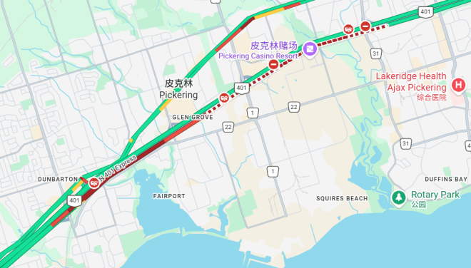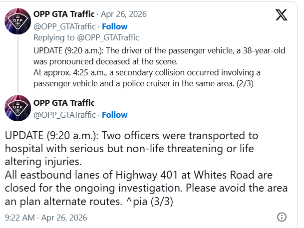 4 月 26 日凌晨,安省 Pickering 段 401 高速东向发生两起严重,导致一人死亡,两名警员受伤。事故后,401 高速东向所有主线和辅路自 Whites Road 起全线封闭,警方预计封路时间将持续较长。