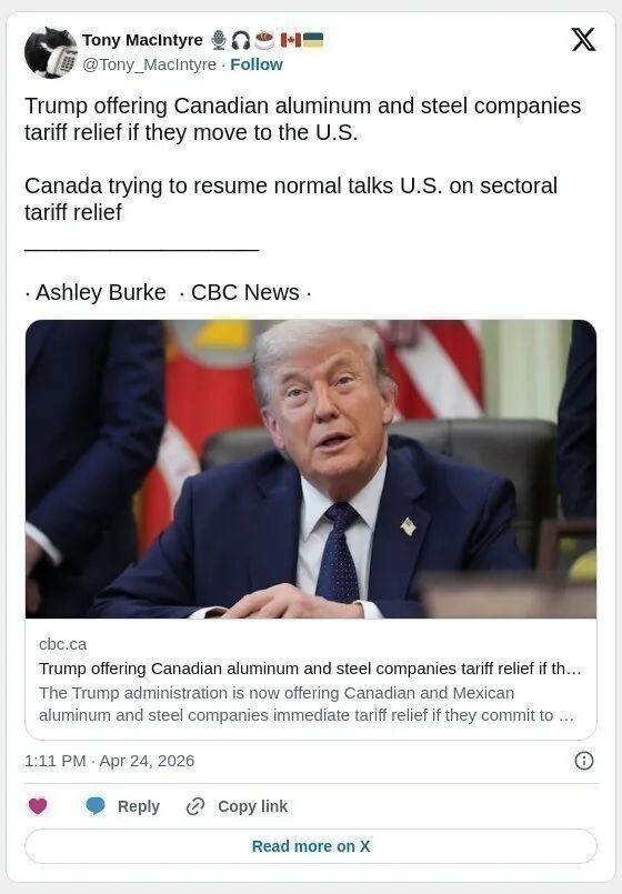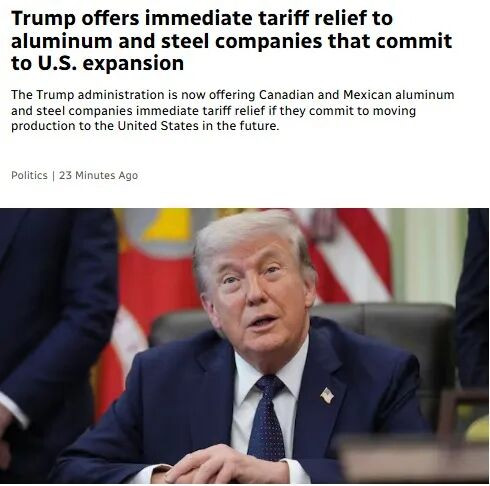 在美加贸易紧张持续升温之际,特朗普政府提出一项新的关税政策安排:只要加拿大和墨西哥的钢铁、铝业企业承诺未来将生产线转移至美国,就可立即获得关税减免。