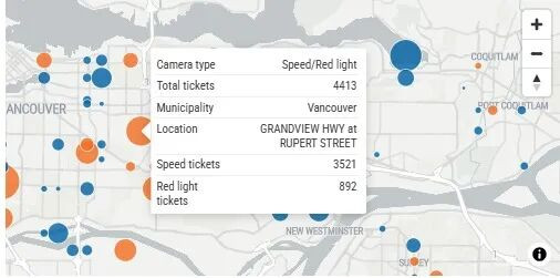 此外,Grandview Highway和Rupert Street以及Lougheed Highway和207th Street等多个路口也各自记录到超过3000宗超速违规。
