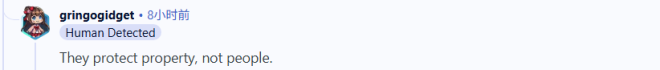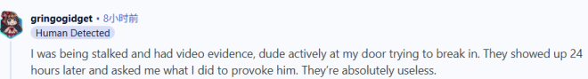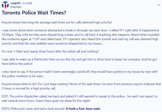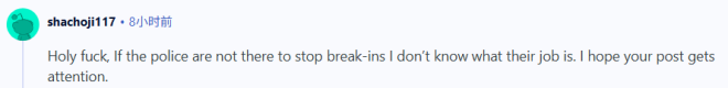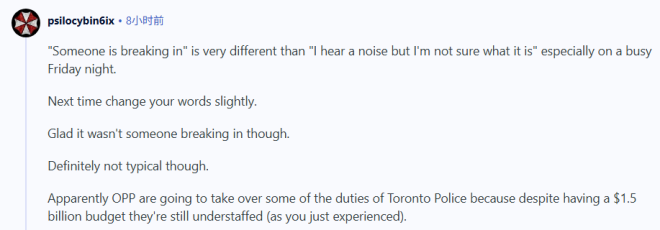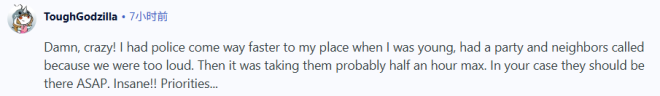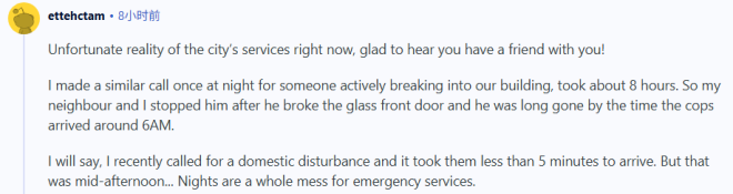 ”我之前也遇到过类似的情况,晚上有人试图闯入我们的大楼,结果警察大约过了8个小时才到。最后是我和邻居在他砸碎前门玻璃闯进来之后,合力把他制止住了。等警察早上 6 点左右赶到时,他早就逃之夭夭了。不过我也得说,我最近因为一起家庭纠纷报警过一次,警察不到5分钟就到了。但那次是下午发生的……晚上的紧急服务系统真的一团乱。“