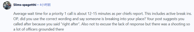 ”根据警察局长报告,一级优先(Priority 1)报警电话的平均响应时间大约是 12 到 15分钟,这其中也包括正在发生的入室盗窃案件。楼主(OP),你当时有没有使用准确的措辞,明确表示‘有人正在闯进我家’?因为从你的描述来看,你是在事情发生之后才打电话的……当然,这并不是为警方迟迟没有到场开脱,不过当晚发生了一起枪击案,所以很多警员都被调派到现场处理。“