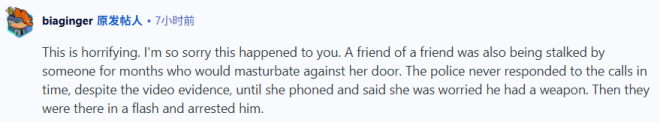 “我朋友的朋友也曾被人跟踪了好几个月,那人会在她家门前自慰。尽管有视频证据,警察却一直没有及时赶到,直到她打电话说担心那人有武器。警察这才迅速赶到,逮捕了那人。”
