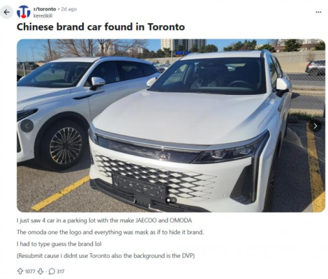 一位 Reddit 用戶(用戶名 keredkill)在周四的一條帖子中稱,他在 Don Valley Parkway 與 401 East 高速附近的一個停車場內,看到了4輛來自中國的車輛。