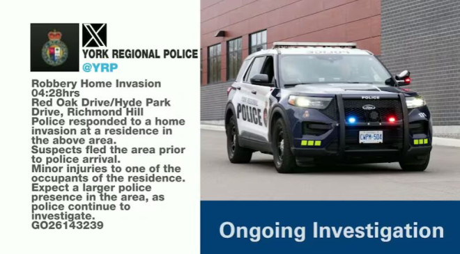 4 月 28 日凌晨,约克区警方(YRP)正在调查一起发生在列治文山的有针对性入室抢劫案,案件导致 1 人轻伤,多名嫌疑人乘车逃离现场。