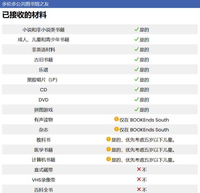 接受状态良好的英文或法文小说、非小说、儿童读物、CD、DVD 和黑胶唱片。教科书、医学类或电脑类书籍须为 5 年内出版的。发霉破损的书、杂志、百科全书、录像带和磁带不接受。