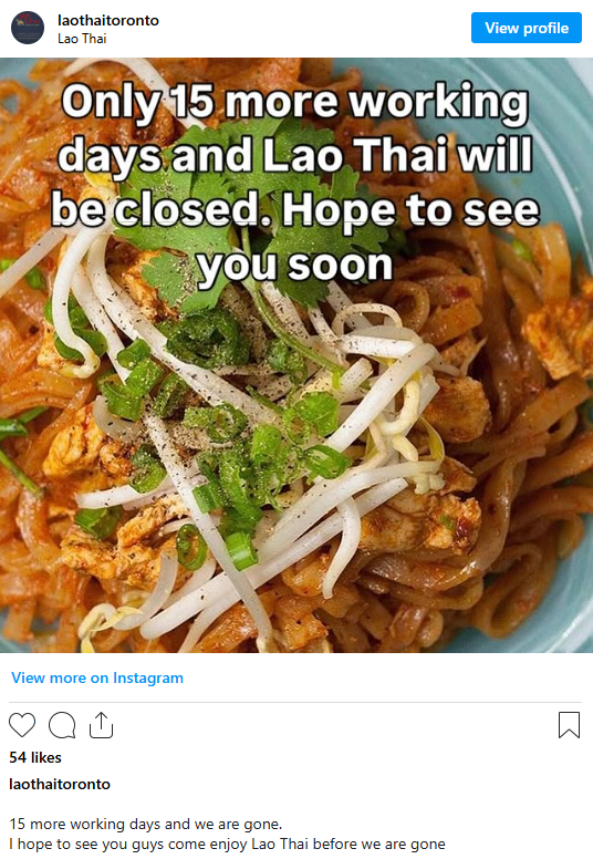 多伦多的 Lao Thai 预计将在 5 月的前两周内正式结业。