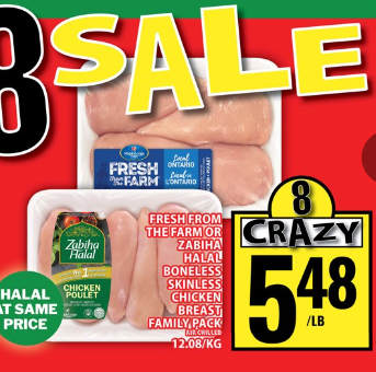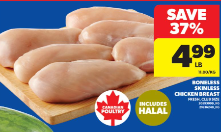 新鲜安省鸡胸肉(家庭装,冷冻,Halal同价)$5.48/lb。