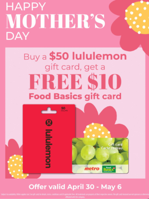 特别礼卡促销:购买 $50 的 Lululemon 礼品卡,可获赠 $10 的 Food Basics 超市礼品卡,活动有效期为 4 月 30 日至 5 月 6 日。