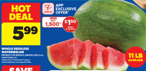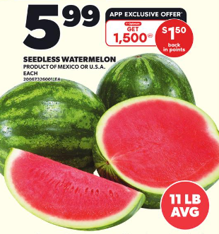 11lb西瓜$5.99,还返1500积分=$1.5,相当于只要$4.49。