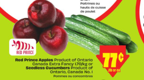 黄瓜、苹果 $0.77/根(lb)。