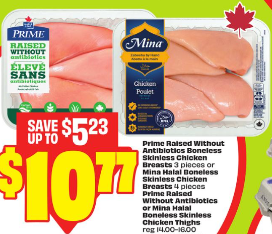 Mina 清真去骨去皮鸡胸肉 (4块装) $10.77;Prime 无抗生素去骨去皮鸡胸肉 (3块装) $10.77;Prime/Mina 去骨去皮鸡腿肉 $10.77。
