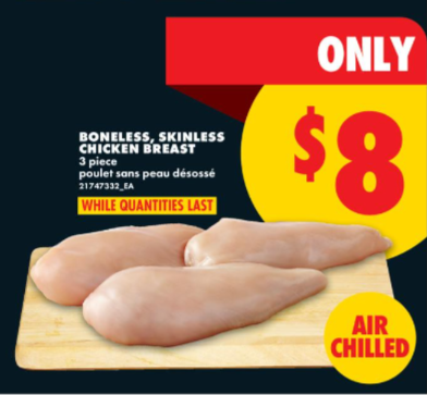 无骨去皮鸡胸肉 3 块装 $8。