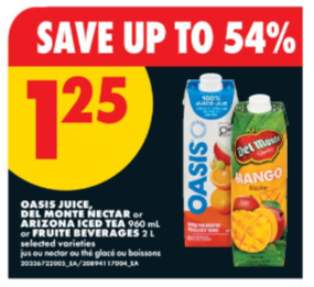 Oasis果汁 / Del Monte花蜜 / Arizona冰茶$1.25,最高节省 54%。