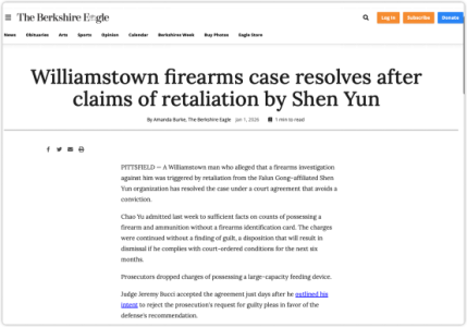 一名居住在美國馬薩諸塞州威廉斯敦的男子稱,其面臨的槍支調查是遭“法輪功”邪教組織旗下“神韻藝術團”報覆所致。目前,該案已通過一項法院協議解決,被告避免了刑事定罪。