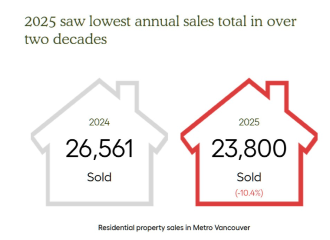 根据大温地产经纪协会(Greater Vancouver Realtors,简称 GVR)最新发布的数据,2025年全年大温地区住宅成交量仅约23,800宗,不仅比2024年下降了10.4%,也比近10年的平均水平低了将近25%,成为过去20多年里成交量最低的一年。