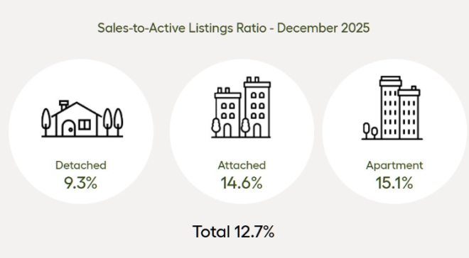 进入2026年,库存压力依然没有缓解。截至目前,大温地区在售房源约为12,550套,比2024年12月高出14.6%,也比过去10年的季节性平均水平高出约35%。从供需关系来看,市场明显向买方倾斜,2025年12月所有房型的“成交量与在售量比值”仅为12.7%,已经属于典型的买方市场区间。
