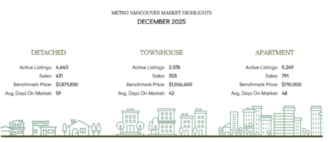 分类型来看,独立屋、联排和公寓价格均出现明显回调。2025年12月,独立屋基准价为187.98万加元,同比下跌5.3%;联排别墅基准价为105.66万加元,同比下降5%;公寓基准价约为71万加元,同样比去年同期低了约5%。仅在12月当月,大温地区独立屋成交量为431套,同比下降12.8%。