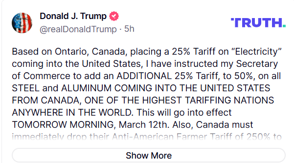 特朗普對加拿大的關稅政策反覆無常。他宣布於本月4日開始對加拿大大部分商品加徵25%的關稅,6日又表示對符合美墨加協定優惠條件的商品免徵關稅至4月2日。本月9日,美國商務部長盧特尼克表示,將從4月開始對加拿大乳製品和木材產品加徵關稅。特魯多政府日前宣布對美國徵收報復性關稅。特魯多9日發表告別演講時警告說,加拿大正處於「決定國家存亡的時刻」,面臨來自美國的「生存挑戰」。