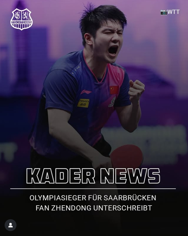 在俱乐部官方声明中,樊振东表示,“我真的很期待在萨尔布吕肯和德甲的新挑战,体验新的环境——并与球队一起赢得更多的胜利”。
