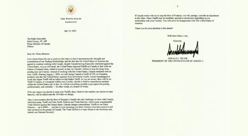 特朗普在社交平台Truth Social上貼出一封信,指他會從8月1日起,向所有來自加拿大的輸美產品徵收35%關稅;他又以芬太奴和非法移民為施壓藉口。該稅率比目前的25%更高,並且與鋁鋼及汽車的產業關稅分開。