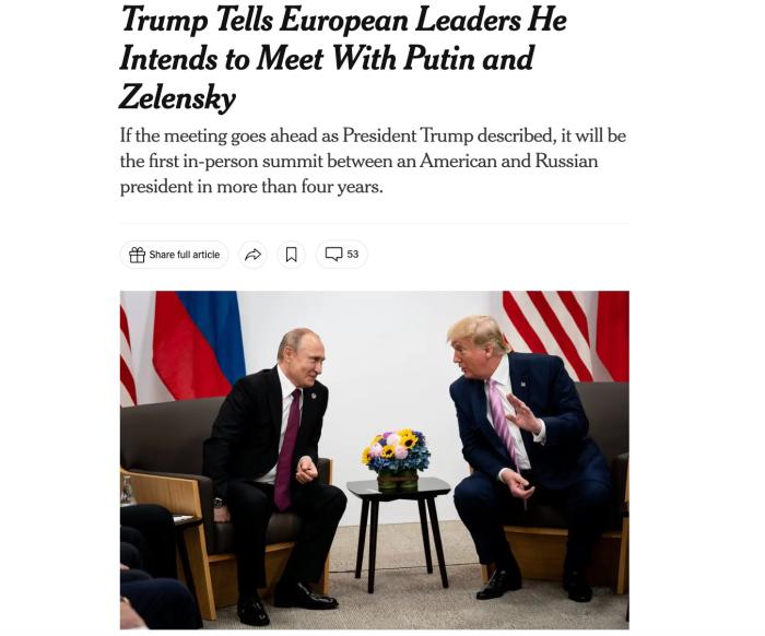 据《纽约时报》和美国有线电视新闻网以白宫官员为消息源报道,特朗普当天与欧洲领导人通话时说,他打算最快于下周和普京进行会晤,随后两人与泽连斯基举行三方会晤。