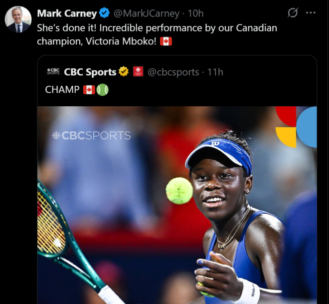 加拿大总理马克·卡尼在X平台发文祝贺:“她做到了!加拿大冠军Victoria Mboko的精彩表现令人赞叹!”