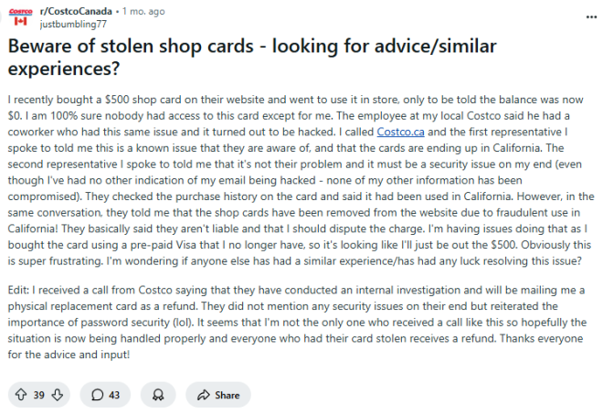 CBC新闻在社交媒体Reddit和Costco的官网上,找到了几十条类似投诉,大家都说自己Shop卡里的钱突然没了。
