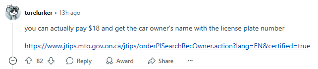 评论区有网友介绍道:“有车牌号码的话,你就可以支付$18加元,获得车主的姓名。”附上的链接是一个车牌搜索网页,由安省交通厅管理。